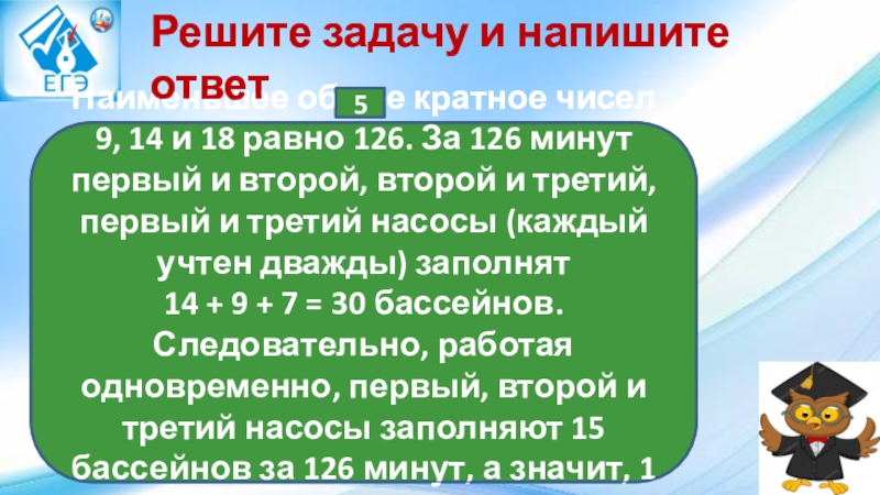 Наименьшее общее кратное чисел 9, 14 и 18 равно 126. За 126 минут первый и второй, второй и третий, первый и третий насосы (каждый учтен дважды) заполнят 14 + 9 + 7 = 30 бассейнов. Следовательно, работая одновременно, первый, второй и третий насосы заполняют 15 бассейнов за 126 минут, а значит, 1 бассейн за 8,4 минуты.