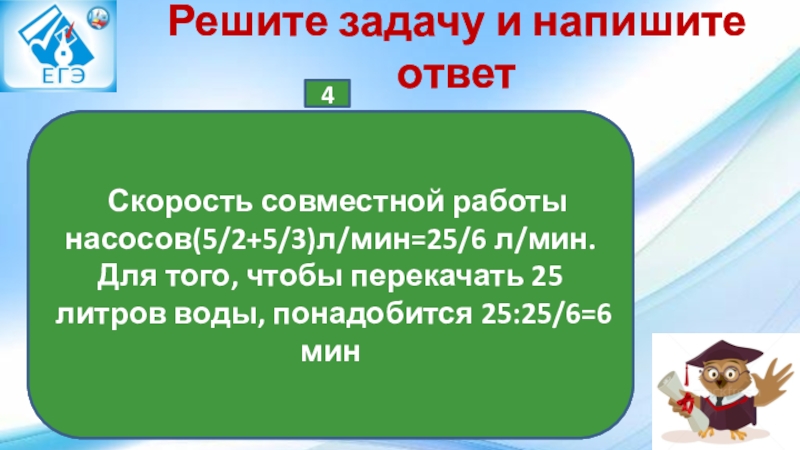 Скорость совместной работы насосов(5/2+5/3)л/мин=25/6 л/мин. Для того, чтобы перекачать 25 литров воды, понадобится 25:25/6=6 мин