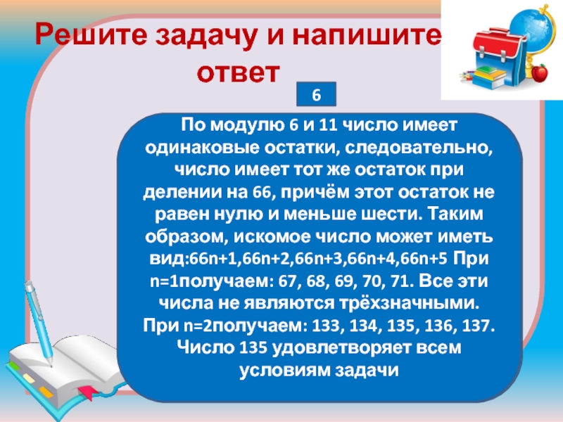 По модулю 6 и 11 число имеет одинаковые остатки, следовательно, число имеет тот же остаток при делении на 66, причём этот остаток не равен нулю и меньше шести. Таким образом, искомое число может иметь вид:66n+1,66n+2,66n+3,66n+4,66n+5 При n=1получаем: 67, 68, 69, 70, 71. Все эти числа не являются трёхзначными.