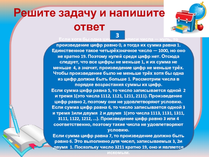 Если хотя бы одна цифра в записи числа — нуль, то произведение цифр равно 0, а тогда их сумма равна 1. Единственное такое четырёхзначное число — 1000, но оно не кратно 19. Поэтому нулей среди цифр нет. Отсюда следует, что все цифры не меньше 1, и их сумма не меньше 4, а значит, произведение цифр не меньше трёх. Чтобы произведение было не меньше трёх хотя бы одна из цифр должна быть больше 1. Рассмотрим числа в порядке возрастания суммы их цифр.