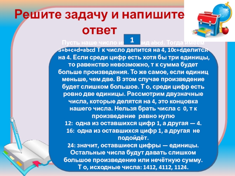 Пусть наше число имеет вид abcd. Тогда имеем a+b+c+d=abcd Т к число делится на 4, 10c+dделится на 4. Если среди цифр есть хотя бы три единицы, то равенство невозможно, т к сумма будет больше произведения. То же самое, если единиц меньше, чем две. В этом случае произведение будет слишком большое. Т о, среди цифр есть ровно две единицы. Рассмотрим двузначные числа, которые делятся на 4, это концовка нашего числа. Нельзя брать числа с 0, т к произведение равно нулю