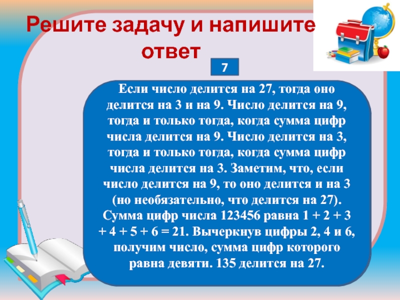 Если число делится на 27, тогда оно делится на 3 и на 9. Число делится на 9, тогда и только тогда, когда сумма цифр числа делится на 9. Число делится на 3, тогда и только тогда, когда сумма цифр числа делится на 3. Заметим, что, если число делится на 9, то оно делится и на 3 (но необязательно, что делится на 27). Сумма цифр числа 123456 равна 1 + 2 + 3 + 4 + 5 + 6 = 21. Вычеркнув цифры 2, 4 и 6, получим число, сумма цифр которого равна девяти. 135 делится на 27.