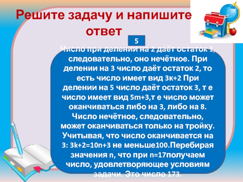 Число при делении на 2 даёт остаток 1, следовательно, оно нечётное. При делении на 3 число даёт остаток 2, то есть число имеет вид 3к+2 При делении на 5 число даёт остаток 3, т е число имеет вид 5m+3,т е число может оканчиваться либо на 3, либо на 8. Число нечётное, следовательно, может оканчиваться только на тройку. Учитывая, что число оканчивается на 3: 3k+2=10n+3 не меньше100.Перебирая значения n, что при n=17получаем число, удовлетворяющее условиям задачи. Это число 173.