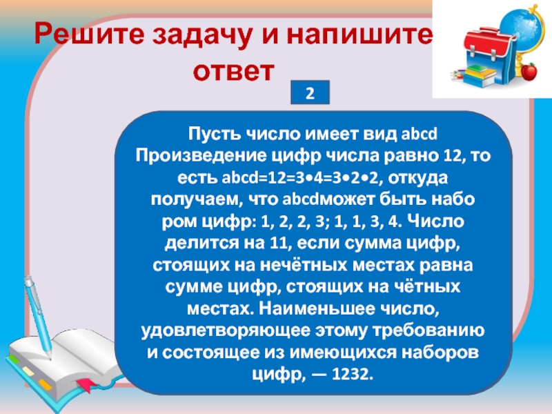 Пусть число имеет вид abcd Произведение цифр числа равно 12, то есть abcd=12=3•4=3•2•2, откуда получаем, что abcdможет быть набором цифр: 1, 2, 2, 3; 1, 1, 3, 4. Число делится на 11, если сумма цифр, стоящих на нечётных местах равна сумме цифр, стоящих на чётных местах. Наименьшее число, удовлетворяющее этому требованию и состоящее из имеющихся наборов цифр, — 1232.