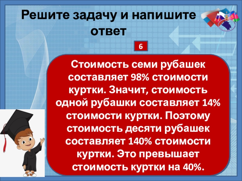 Стоимость семи рубашек составляет 98% стоимости куртки. Значит, стоимость одной рубашки составляет 14% стоимости куртки. Поэтому стоимость десяти рубашек составляет 140% стоимости куртки. Это превышает стоимость куртки на 40%.
