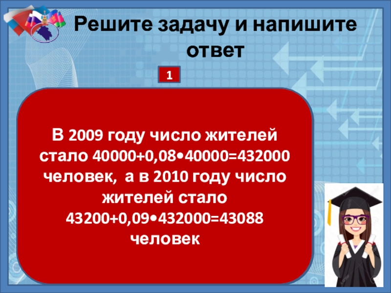 В 2009 году число жителей стало 40000+0,08•40000=432000 человек, а в 2010 году число жителей стало 43200+0,09•432000=43088 человек