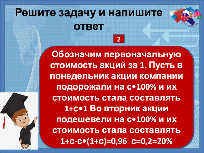 Обозначим первоначальную стоимость акций за 1. Пусть в понедельник акции компании подорожали на с•100% и их стоимость стала составлять 1+с•1 Во вторник акции подешевели на с•100% и их стоимость стала составлять 1+с-с•(1+с)=0,96 с=0,2=20%