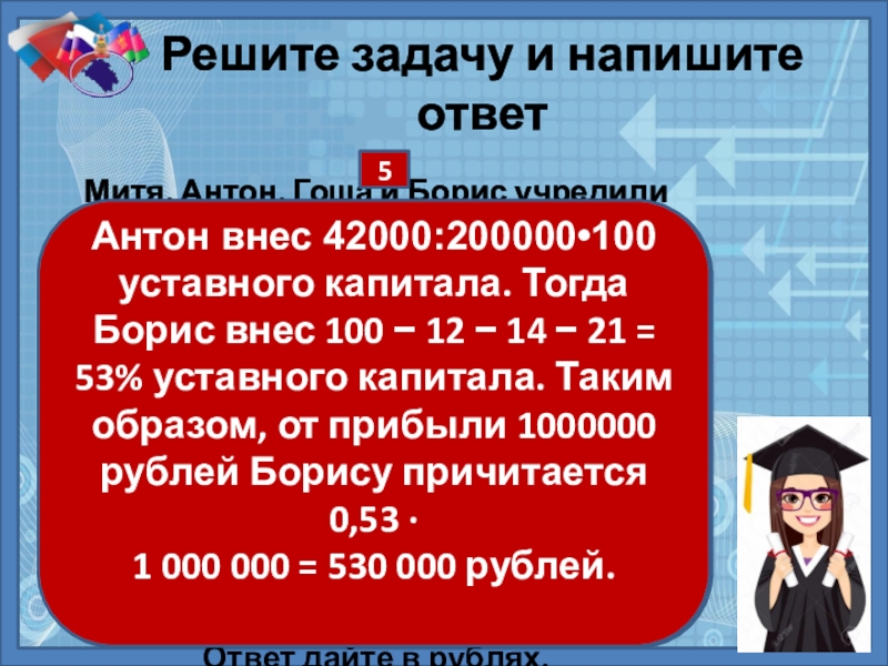 Антон внес 42000:200000•100 уставного капитала. Тогда Борис внес 100 − 12 − 14 − 21 = 53% уставного капитала. Таким образом, от прибыли 1000000 рублей Борису причитается 0,53 ·