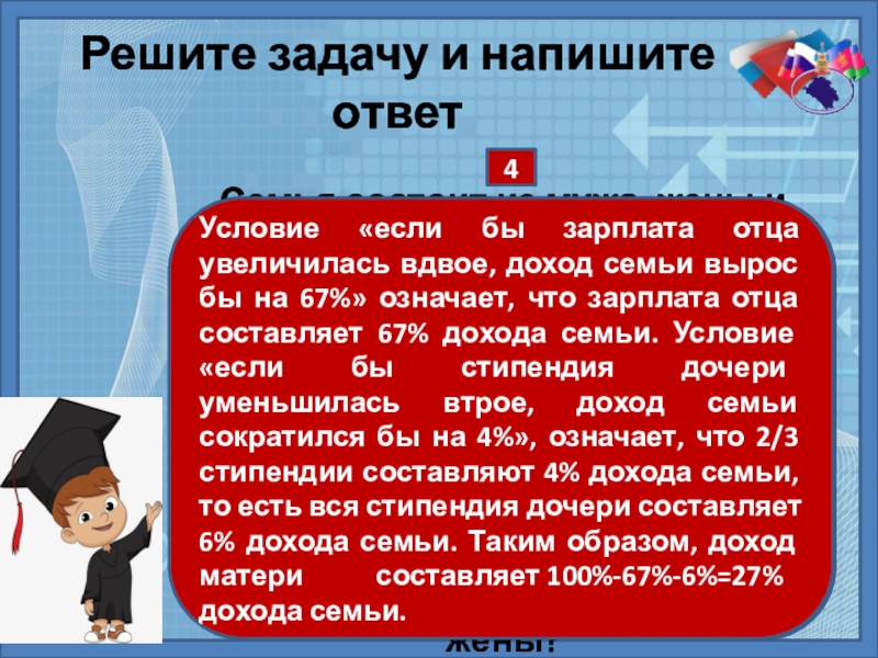 Условие «если бы зарплата отца увеличилась вдвое, доход семьи вырос бы на 67%» означает, что зарплата отца составляет 67% дохода семьи. Условие «если бы стипендия дочери уменьшилась втрое, доход семьи сократился бы на 4%», означает, что 2/3 стипендии составляют 4% дохода семьи, то есть вся стипендия дочери составляет 6% дохода семьи. Таким образом, доход матери составляет 100%-67%-6%=27% дохода семьи.