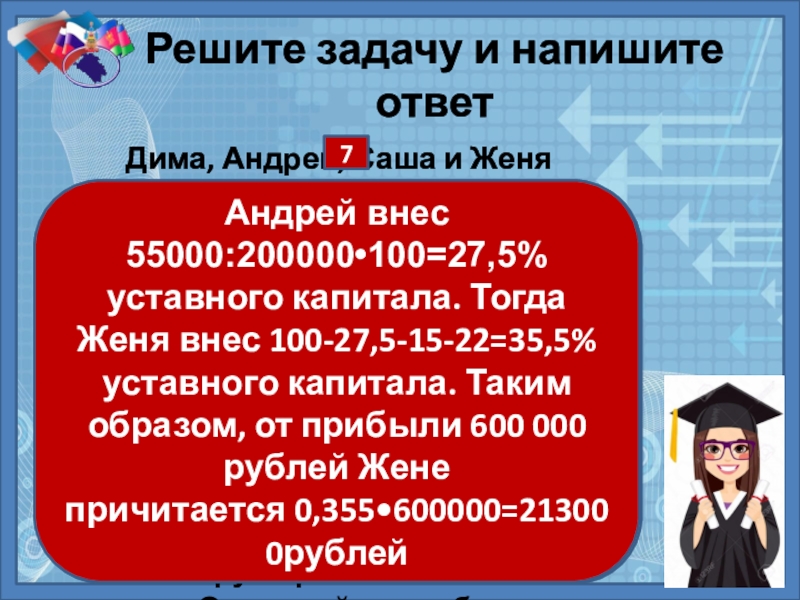 Андрей внес 55000:200000•100=27,5% уставного капитала. Тогда Женя внес 100-27,5-15-22=35,5% уставного капитала. Таким образом, от прибыли 600 000 рублей Жене причитается 0,355•600000=213000рублей