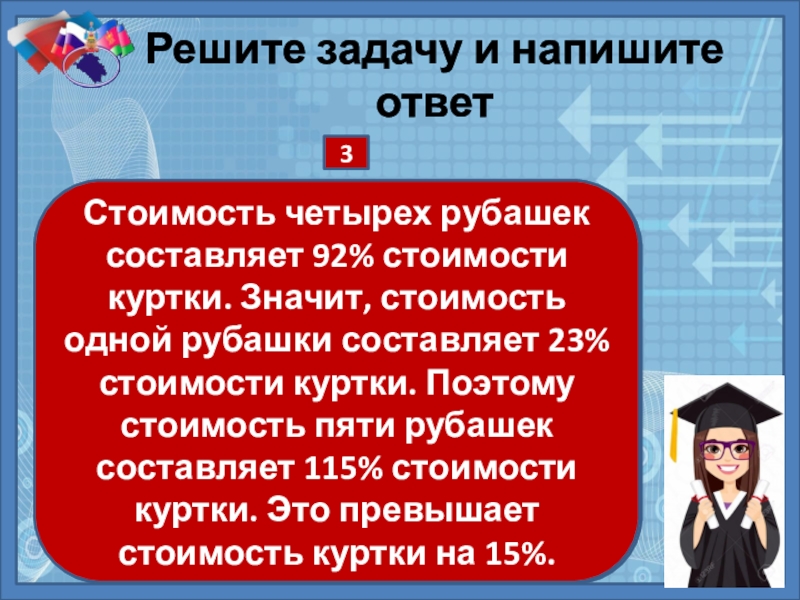 Стоимость четырех рубашек составляет 92% стоимости куртки. Значит, стоимость одной рубашки составляет 23% стоимости куртки. Поэтому стоимость пяти рубашек составляет 115% стоимости куртки. Это превышает стоимость куртки на 15%.