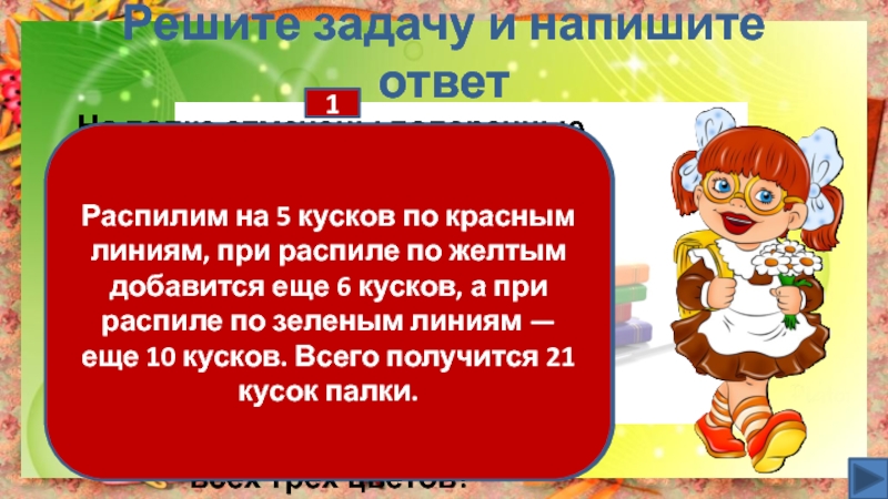 Распилим на 5 кусков по красным линиям, при распиле по желтым добавится еще 6 кусков, а при распиле по зеленым линиям — еще 10 кусков. Всего получится 21 кусок палки.