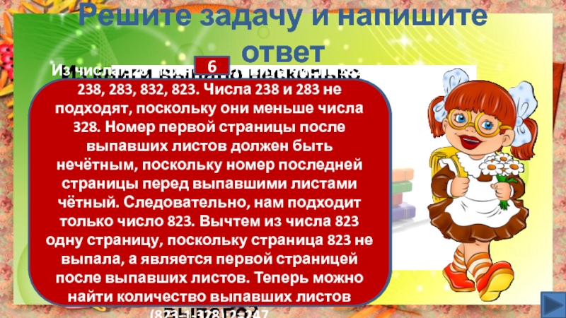 Из числа 328 можно составить числа 382, 238, 283, 832, 823. Числа 238 и 283 не подходят, поскольку они меньше числа 328. Номер первой страницы после выпавших листов должен быть нечётным, поскольку номер последней страницы перед выпавшими листами чётный. Следовательно, нам подходит только число 823. Вычтем из числа 823 одну страницу, поскольку страница 823 не выпала, а является первой страницей после выпавших листов. Теперь можно найти количество выпавших листов (823-1-328):2=247