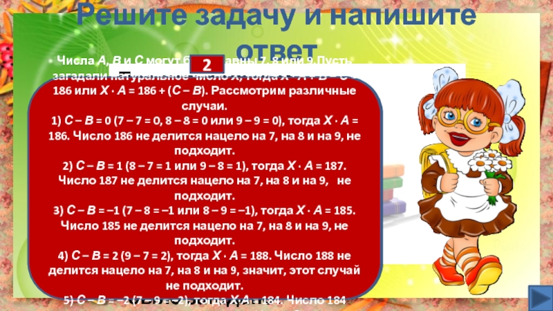3) С – В = –1 (7 – 8 = –1 или 8 – 9 = –1), тогда Х · А = 185. Число 185 не делится нацело на 7, на 8 и на 9, не подходит.