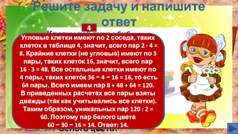 Угловые клетки имеют по 2 соседа, таких клеток в таблице 4, значит, всего пар 2 · 4 = 8. Крайние клетки (не угловые) имеют по 3 пары, таких клеток 16, значит, всего пар 16 · 3 = 48. Все остальные клетки имеют по 4 пары, таких клеток 36 − 4 − 16 = 16, то есть 64 пары. Всего имеем пар 8 + 48 + 64 = 120. В приведенных расчетах все пары взяты дважды (так как учитывались все клетки). Таким образом, уникальных пар 120 : 2 = 60. Поэтому пар белого цвета 60 − 30 − 16 = 14. Ответ: 14.