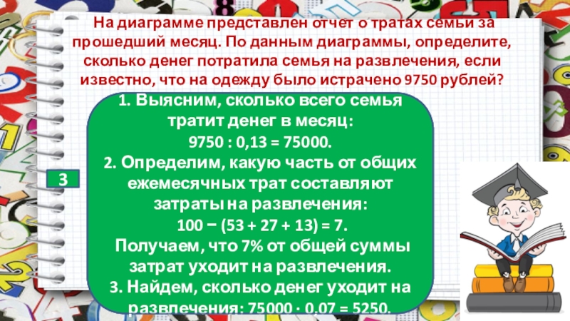 1. Выясним, сколько всего семья тратит денег в месяц: 9750 : 0,13 = 75000.