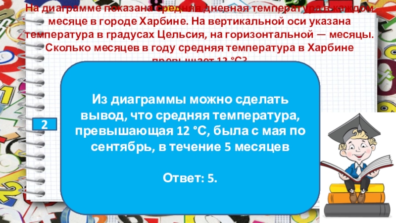 Из диаграммы можно сделать вывод, что средняя температура, превышающая 12 °С, была с мая по сентябрь, в течение 5 месяцев