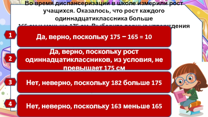 Да, верно, поскольку рост одиннадцатиклассников, из условия, не превышает 175 см