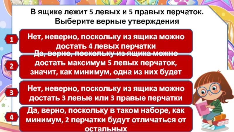 Если достать 4 перчатки, то среди них обязательно будет правая перчатка