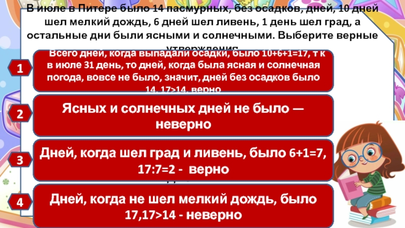 Всего дней, когда выпадали осадки, было 10+6+1=17, т к в июле 31 день, то дней, когда была ясная и солнечная погода, вовсе не было, значит, дней без осадков было 14, 17>14, верно