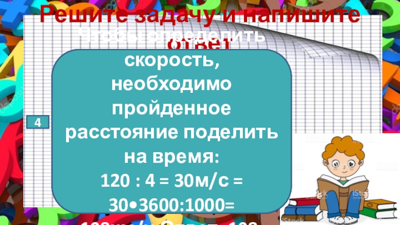 Чтобы определить скорость, необходимо пройденное расстояние поделить на время: 120 : 4 = 30м/с =