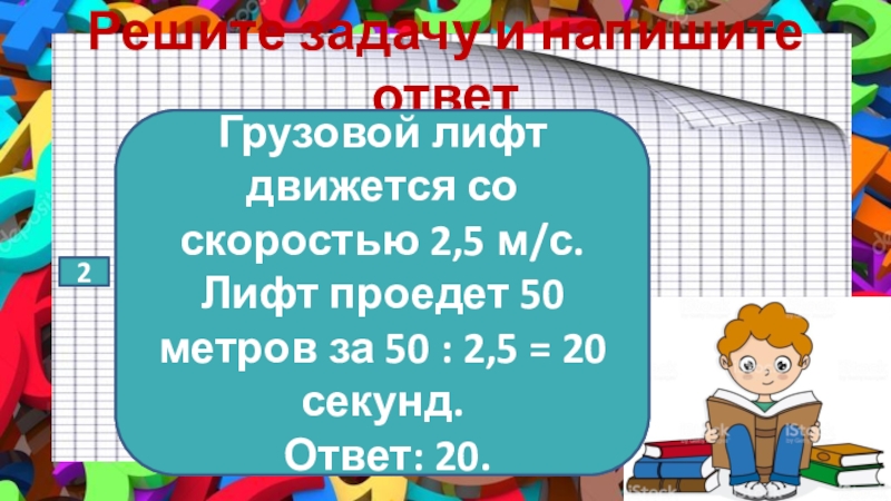 Грузовой лифт движется со скоростью 2,5 м/с. Лифт проедет 50 метров за 50 : 2,5 = 20 секунд.
