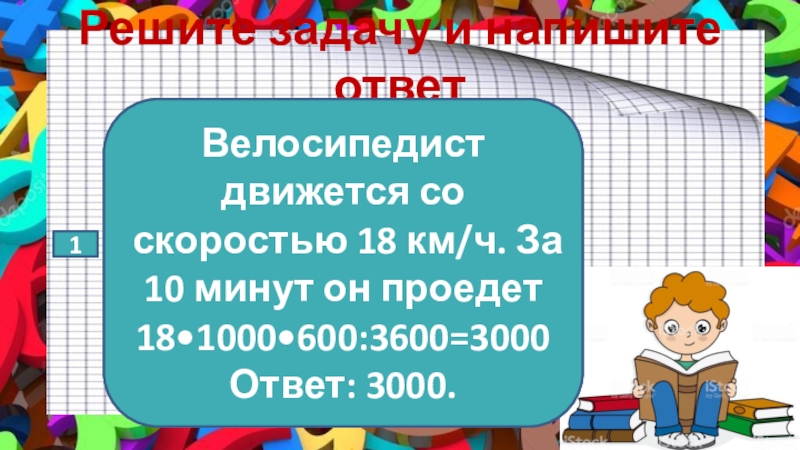 Велосипедист движется со скоростью 18 км/ч. За 10 минут он проедет 18•1000•600:3600=3000Ответ: 3000.