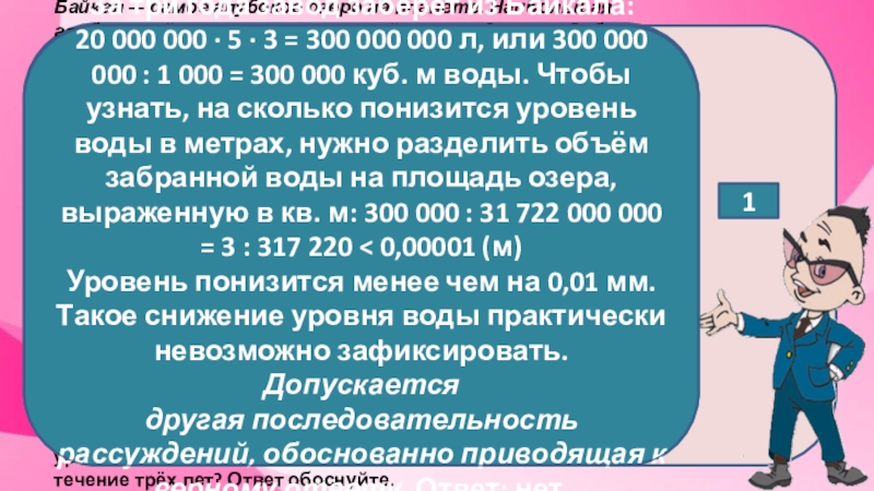 20 000 000 · 5 · 3 = 300 000 000 л, или 300 000 000 : 1 000 = 300 000 куб. м воды. Чтобы узнать, на сколько понизится уровень воды в метрах, нужно разделить объём забранной воды на площадь озера, выраженную в кв. м: 300 000 : 31 722 000 000 = 3 : 317 220 < 0,00001 (м)