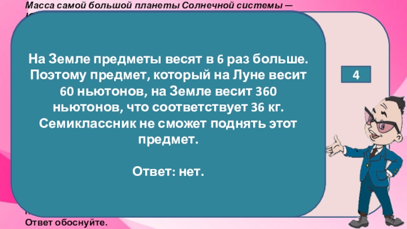 На Земле предметы весят в 6 раз больше. Поэтому предмет, который на Луне весит 60 ньютонов, на Земле весит 360 ньютонов, что соответствует 36 кг. Семиклассник не сможет поднять этот предмет.