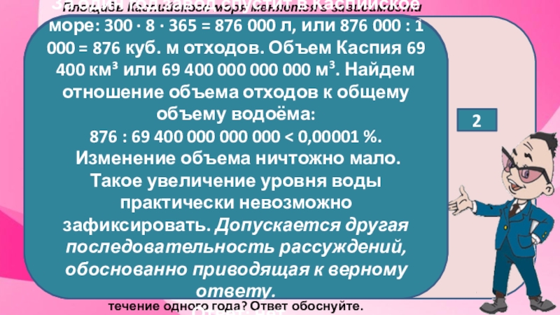 За один год завод спустит в Каспийское море: 300 · 8 · 365 = 876 000 л, или 876 000 : 1 000 = 876 куб. м отходов. Объем Каспия 69 400 км³ или 69 400 000 000 000 м3. Найдем отношение объема отходов к общему объему водоёма: