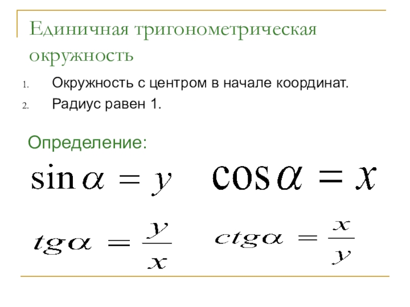 Единичная тригонометрическая окружностьОкружность с центром в начале координат.Радиус равен 1.Определение: