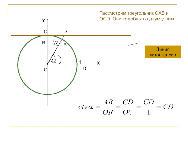 Линия котангенсовYXAOD1Рассмотрим треугольник OAB и OCD. Они подобны по двум углам.BCD