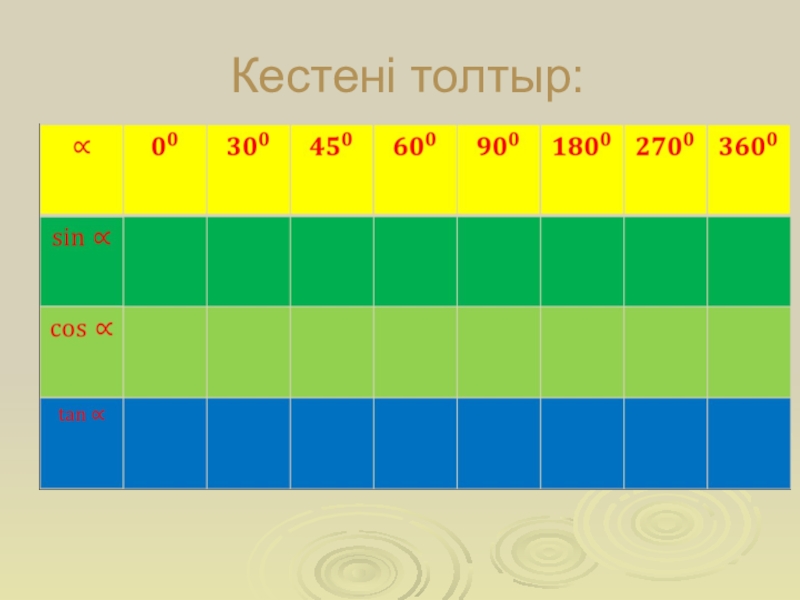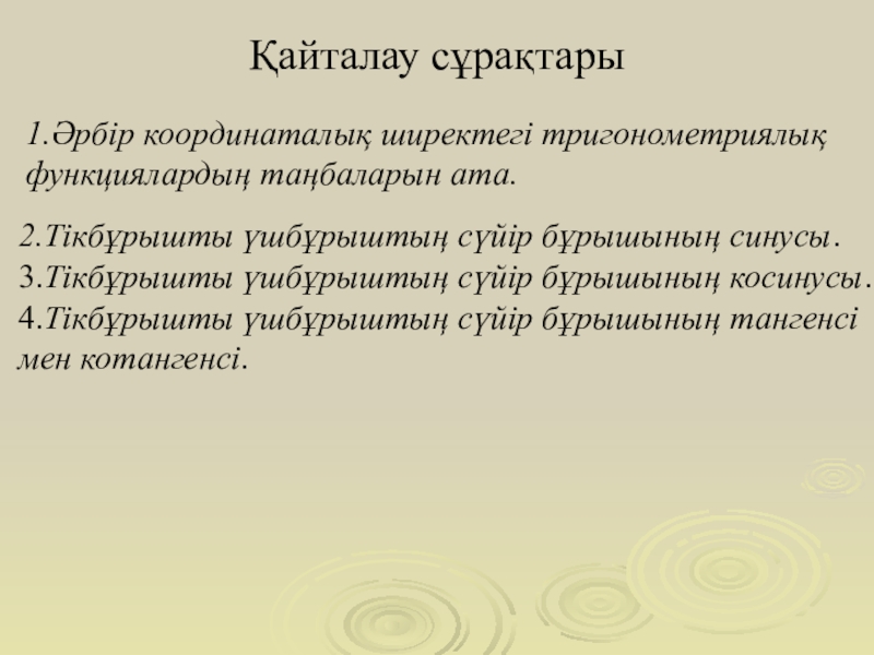 1.Әрбір координаталық ширектегі тригонометриялық функциялардың таңбаларын ата.