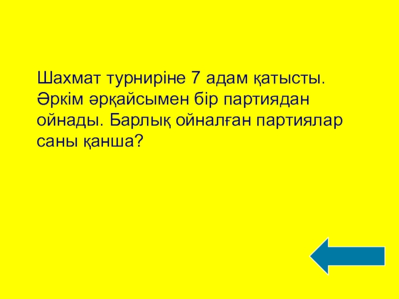 Шахмат турниріне 7 адам қатысты. Әркім әрқайсымен бір партиядан ойнады. Барлық ойналған партиялар саны қанша?