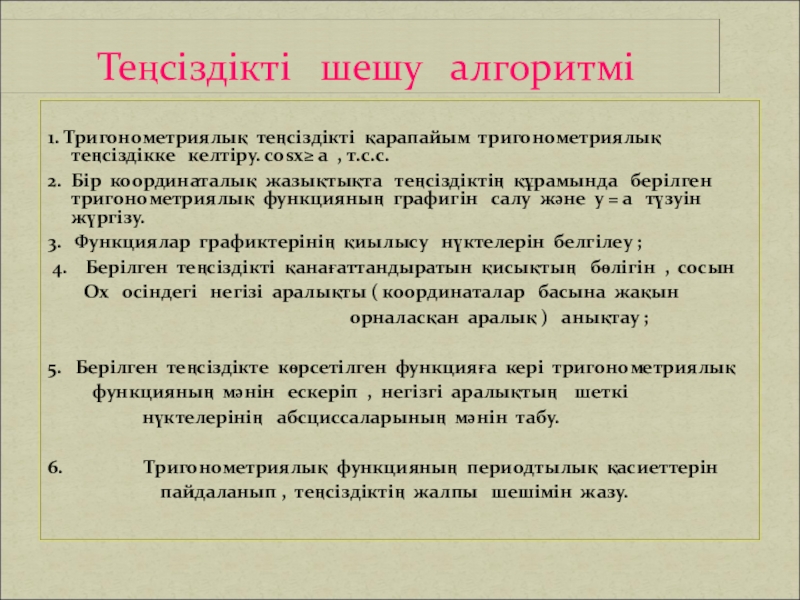 сosx ≥ а , сosx ≤ а теңсіздігін шешу және у = cosx функциясының графигін көрнекі етіп салу арқылы зерттеп көрсету.