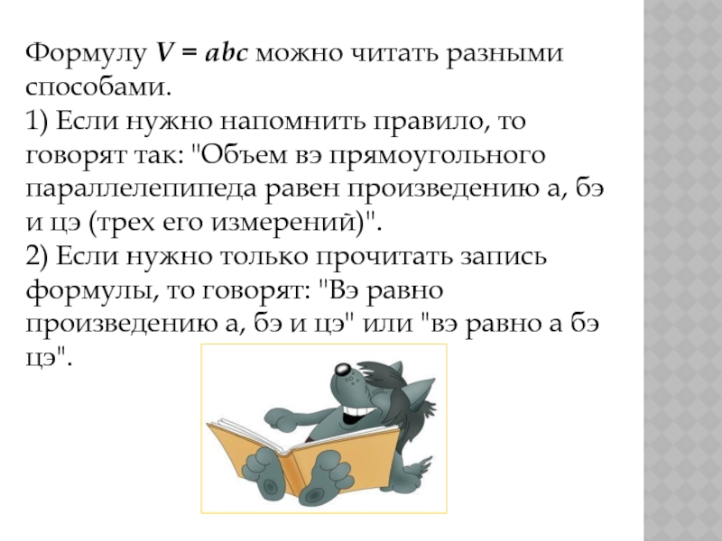 Формулу V = abc можно читать разными способами.1) Если нужно напомнить правило, то говорят так:
