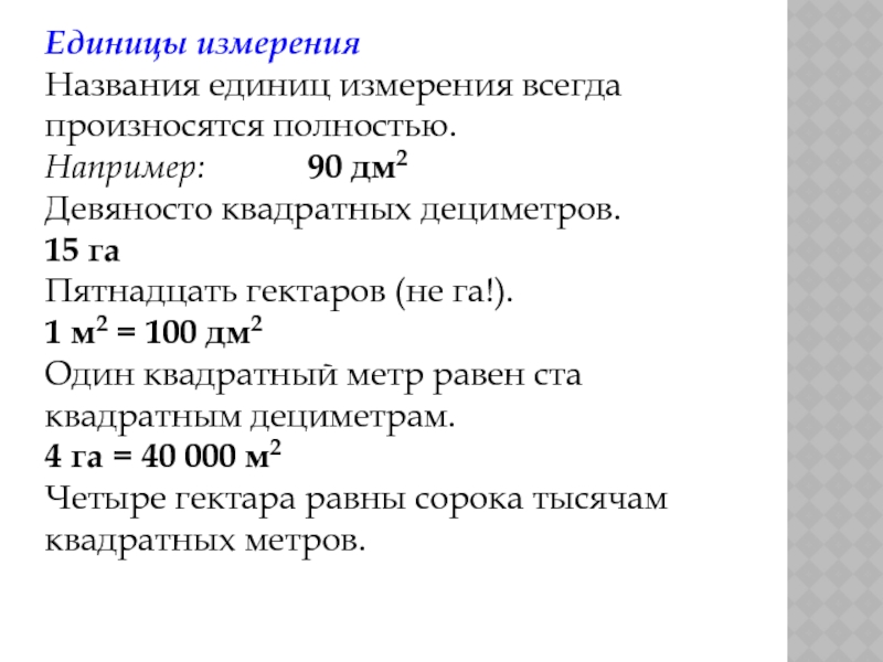 Единицы измеренияНазвания единиц измерения всегда произносятся полностью.Например: 90 дм2Девяносто квадратных дециметров.15 гаПятнадцать гектаров (не га!).1 м2 = 100 дм2Один квадратный метр равен ста квадратным дециметрам.4 га = 40 000 м2Четыре гектара