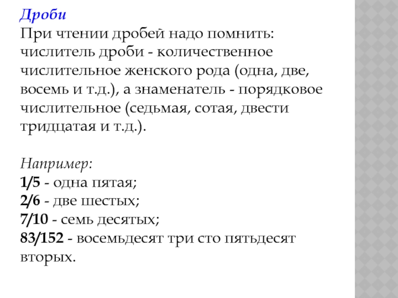 ДробиПри чтении дробей надо помнить: числитель дроби - количественное числительное женского рода (одна, две, восемь и т.д.),