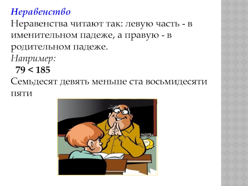 НеравенствоНеравенства читают так: левую часть - в именительном падеже, а правую - в родительном падеже. Например: