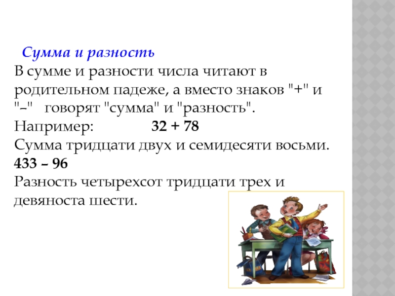 падеже, а вместо знаков "+" и "–" говорят "сумма" и "разность".
