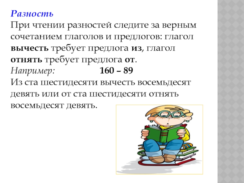РазностьПри чтении разностей следите за верным сочетанием глаголов и предлогов: глагол вычесть требует предлога из, глагол отнять