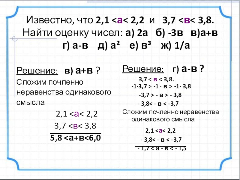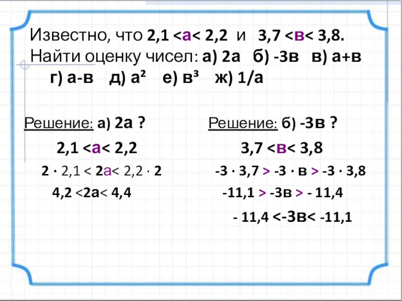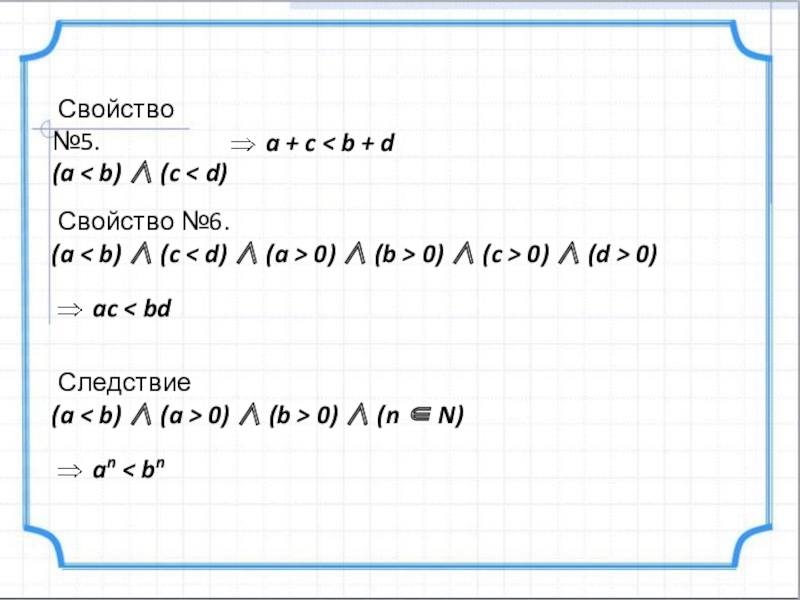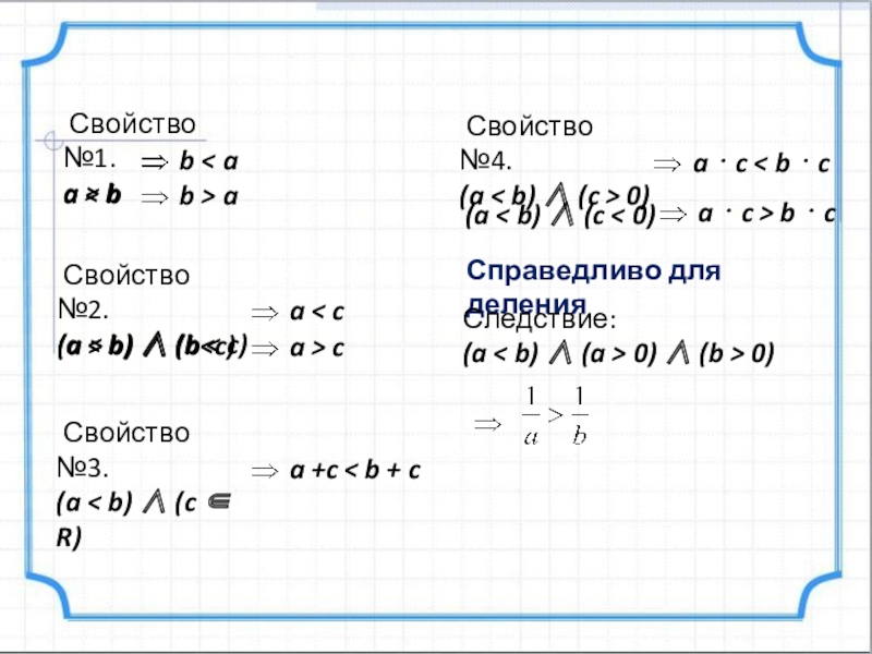 (a > b) ∧ (b Свойство №3. a +c < b + c Свойство №4. a ⋅ c < b ⋅ c (a < b) ∧ (c < 0) a ⋅ c > b ⋅ c Справедливо для деления Следствие: