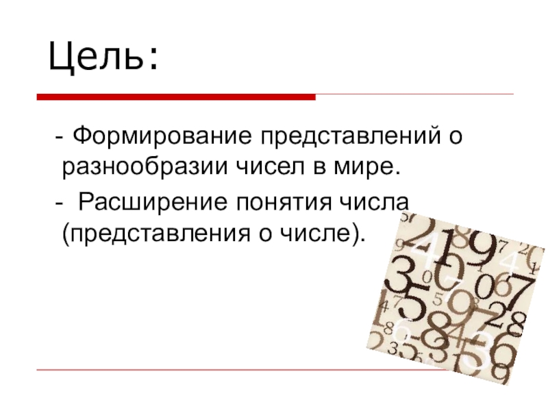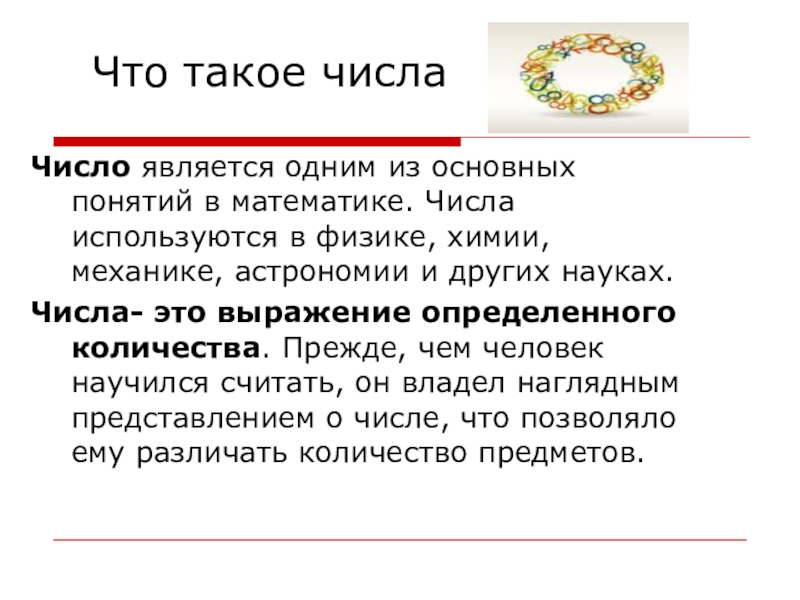 Числа- это выражение определенного количества. Прежде, чем человек научился считать, он владел наглядным представлением о числе, что позволяло ему различать количество предметов.