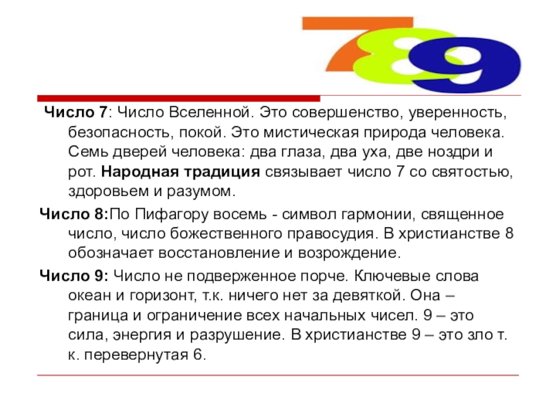 Число 9: Число не подверженное порче. Ключевые слова океан и горизонт, т.к. ничего нет за девяткой. Она – граница и ограничение всех начальных чисел. 9 – это сила, энергия и разрушение. В христианстве 9 – это зло т.к. перевернутая 6.