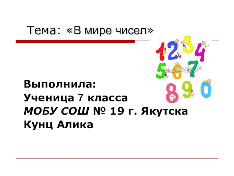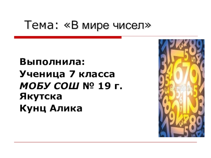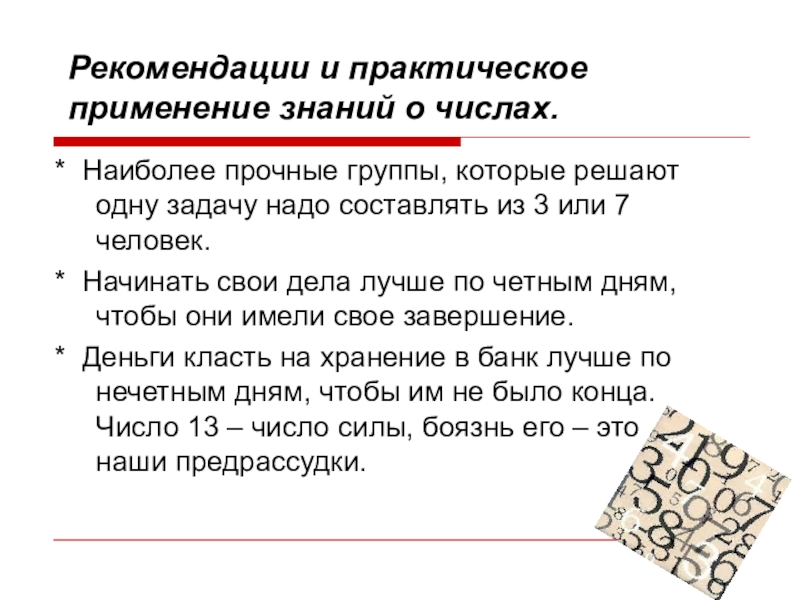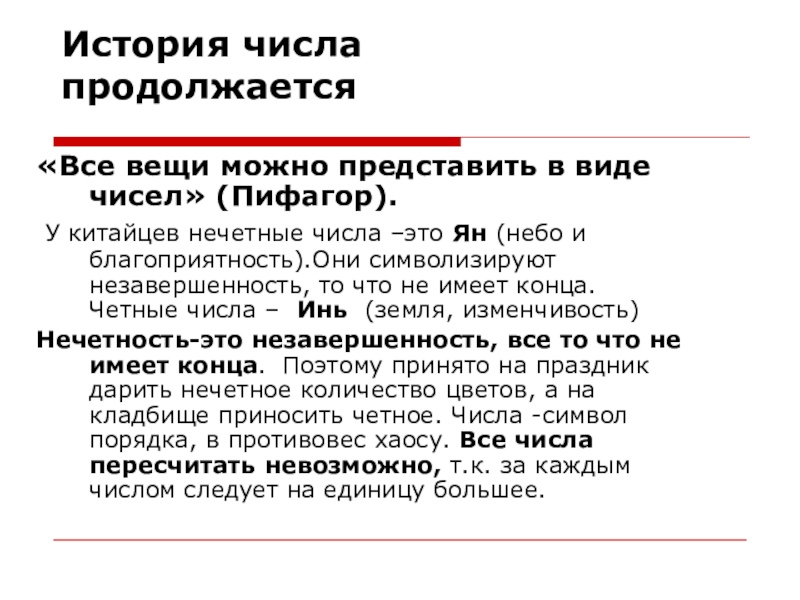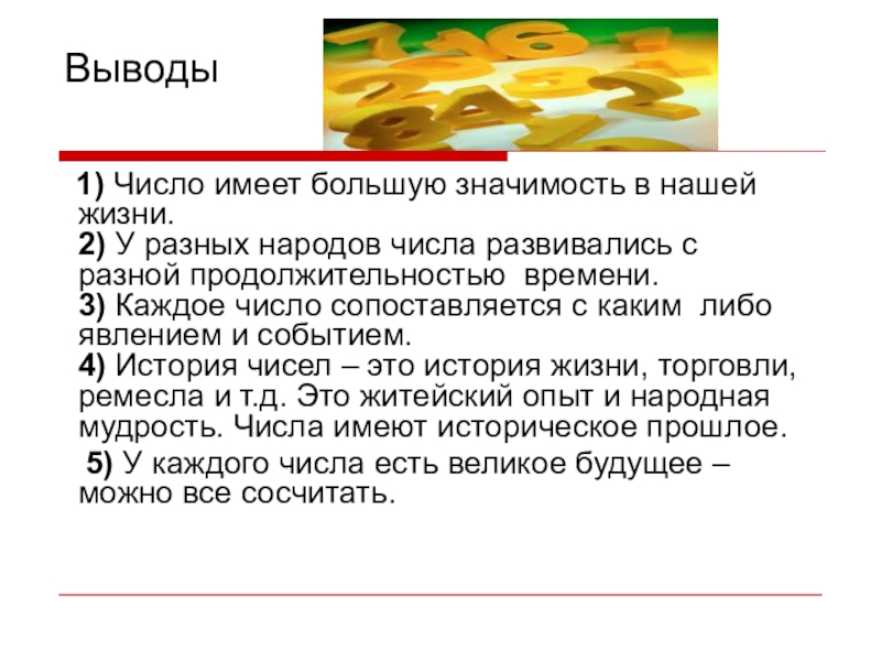 нашей жизни. 2) У разных народов числа развивались с разной продолжительностью времени. 3) Каждое число сопоставляется с каким либо явлением и событием. 4) История чисел – это история жизни, торговли, ремесла и т.д. Это житейский опыт и народная мудрость. Числа имеют историческое прошлое.