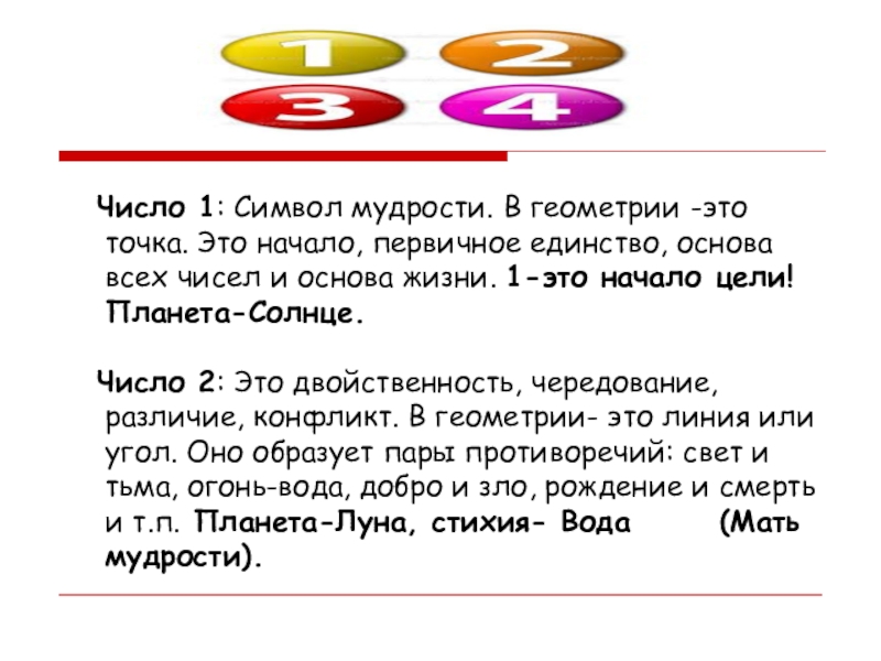 Число 2: Это двойственность, чередование, различие, конфликт. В геометрии- это линия или угол. Оно образует пары противоречий: свет и тьма, огонь-вода, добро и зло, рождение и смерть и т.п. Планета-Луна, стихия- Вода (Мать мудрости).