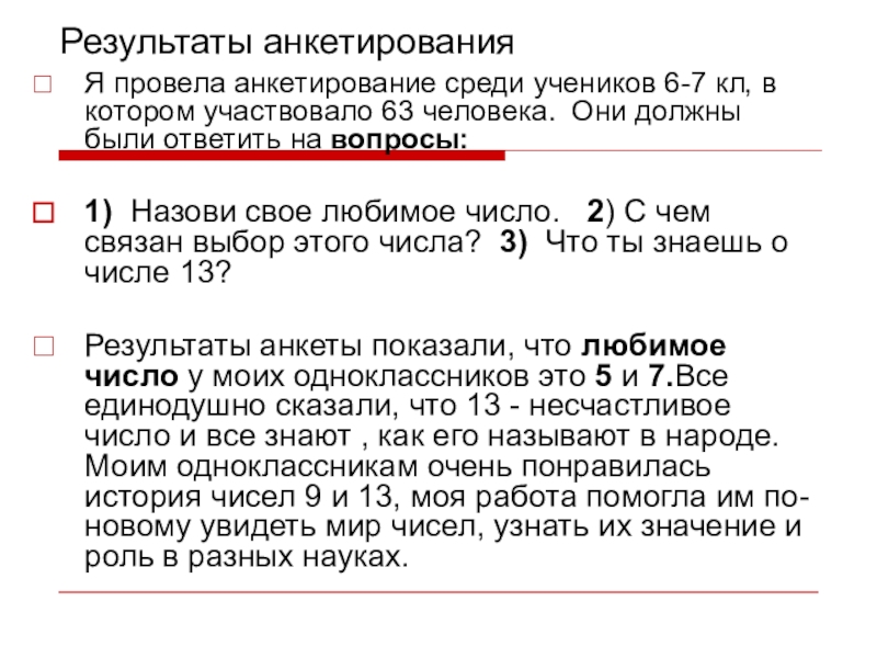 Результаты анкеты показали, что любимое число у моих одноклассников это 5 и 7.Все единодушно сказали, что 13 - несчастливое число и все знают , как его называют в народе. Моим одноклассникам очень понравилась история чисел 9 и 13, моя работа помогла им по-новому увидеть мир чисел, узнать их значение и роль в разных науках.