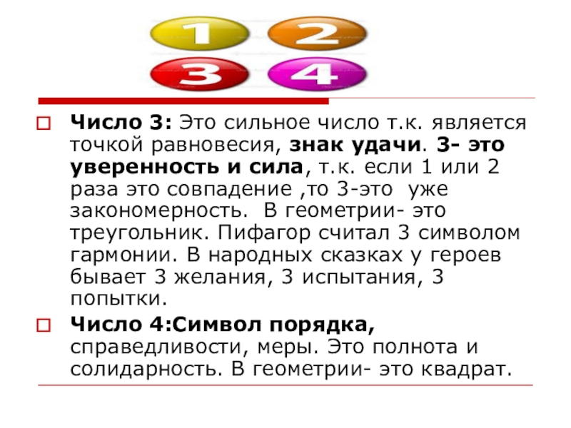 Число 3: Это сильное число т.к. является точкой равновесия, знак удачи.