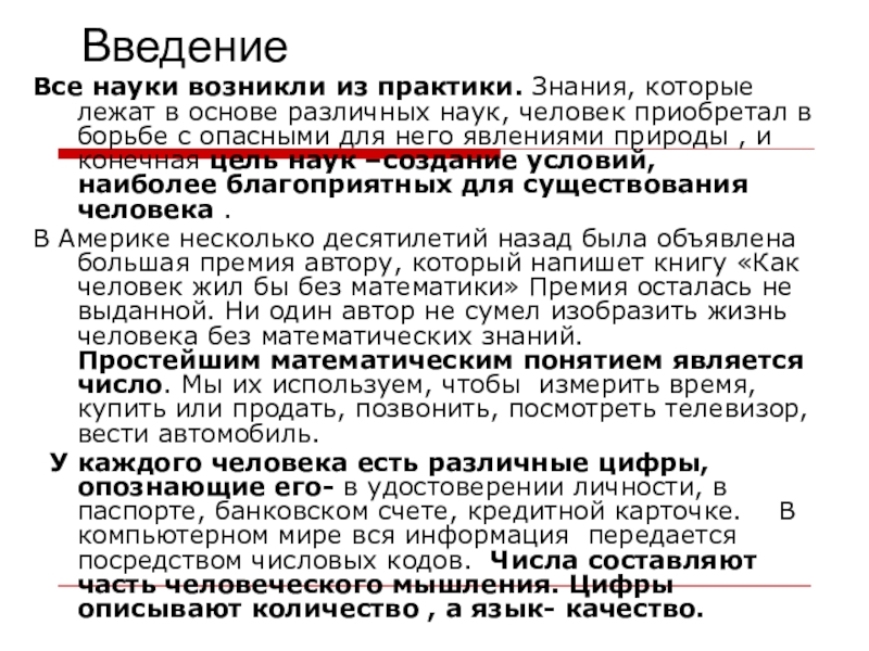В Америке несколько десятилетий назад была объявлена большая премия автору, который напишет книгу «Как человек жил бы без математики» Премия осталась не выданной. Ни один автор не сумел изобразить жизнь человека без математических знаний. Простейшим математическим понятием является число. Мы их используем, чтобы измерить время, купить или продать, позвонить, посмотреть телевизор, вести автомобиль.