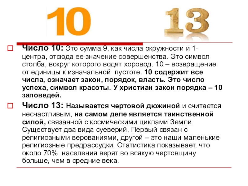 Число 13: Называется чертовой дюжиной и считается несчастливым, на самом деле является таинственной силой, связанной с космическими циклами Земли. Существует два вида суеверий. Первый связан с религиозными верованиями, другой – это наши маленькие религиозные предрассудки. Статистика показывает, что около 70% населения верят во всякую чертовщину больше, чем в средние века.